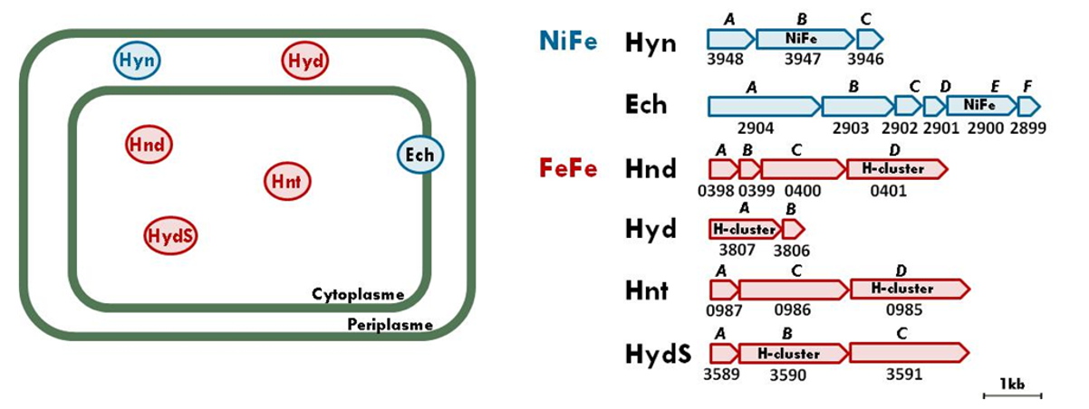 Solidesulfovibrio fructosivorans and its hydrogenase system: on the left, their cellular localization; on the right, their operons (Baffert et al., 2019)