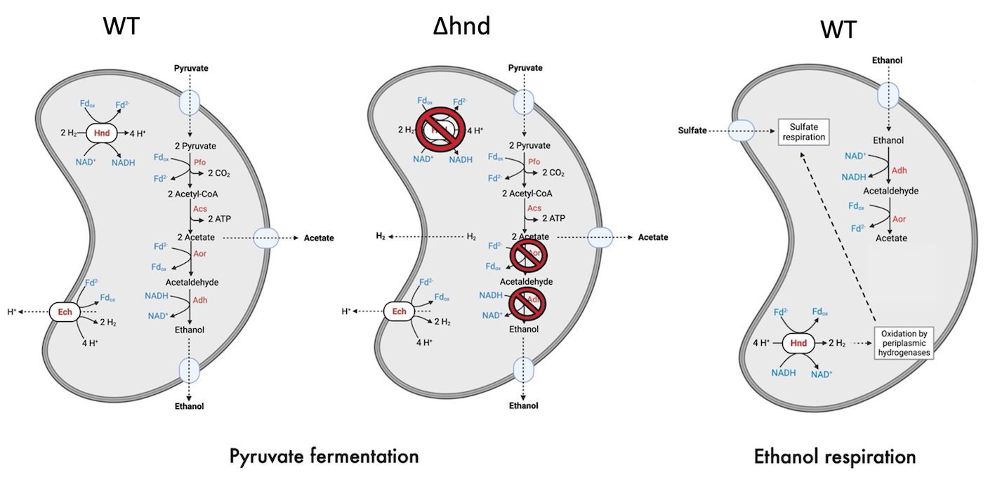 It has been shown that these hydrogenases couple proton reduction with the endergonic oxidation of NADH and the concomitant exergonic oxidation of reduced ferredoxin (and/or the reverse reaction). We are studying this enzyme from its molecular functioning to its physiological role in bacteria. With regard to its involvement in bacterial physiology, we have shown that Hnd is involved in ethanol metabolism. It is a reversible hydrogenase that functions by consuming H2 through an electron bifurcation mechanism during pyruvate fermentation and by producing H2 through an electron confurcation mechanism when the bacterium uses ethanol as an electron donor, a condition in which Hnd is essential for bacterial growth.