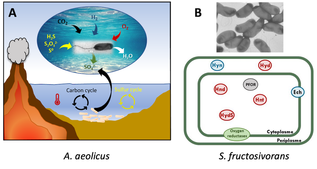 A: A. aeolicus is a marine bacterium isolated near shallow underwater volcanic vents on the island of Vulcano (Italy). It feeds on molecular hydrogen, carbon dioxide, molecular oxygen, and minerals, releasing only water. In addition to H2, inorganic sulfur compounds can also be oxidized to sulfate. (Guiral & Giudici-Orticoni, 2021). B: S. fructosivorans is a mesophilic anaerobic bacterium isolated from sediments. It has a complex system of hydrogenases.